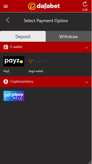 दाफाबेट खिलाड़ियों को जमा और निकासी दोनों के लिए विभिन्न आधुनिक और पारंपरिक भुगतान विधियों का उपयोग करने का विकल्प प्रदान करता है, जिसमें क्रेडिट कार्ड, डेबिट कार्ड, प्रीपेड कार्ड, बैंक वायर ट्रांसफर और इलेक्ट्रॉनिक वॉलेट शामिल हैं। ब्रांड कई क्रिप्टोकरेंसी भी स्वीकार करता है, इसलिए जो लोग भुगतान के लिए अधिक गुमनाम और सुरक्षित दृष्टिकोण पसंद करते हैं, वे खुश होंगे।