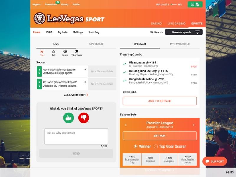 लियोवेगास स्पोर्ट अपने फ्रंट-एंड यूजर इंटरफेस, ऑड्स संकलन और ग्राहक इंटेलिजेंस के लिए काम्बी स्पोर्ट्सबुक प्लेटफॉर्म पर चलने वाले पहले ऑपरेटरों में से एक है।