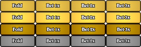рдЬрдм рдкрд╛рдБрдЪ рдХрд╛рд░реНрдб рдмрд╛рдБрдЯреЗ рдЬрд╛рдПрдБрдЧреЗ, рддреЛ рдЖрдкрдХреЛ рджреЛ рдХрд╛рд░реНрдб рдКрдкрд░ рдХреА рдУрд░ рдФрд░ рддреАрди рдХрд╛рд░реНрдб рдиреАрдЪреЗ рдХреА рдУрд░ рдорд┐рд▓реЗрдВрдЧреЗред рдЖрдкрдХреЗ рдирд┐рдпрдВрддреНрд░рдг рдмрдЯрди рдЪрд╛рд░ рд╡реИрдХрд▓реНрдкрд┐рдХ рдмрдЯрдиреЛрдВ рд╕реЗ рдмрджрд▓ рдЬрд╛рдПрдБрдЧреЗ: рдлреЛрд▓реНрдб, рдмреЗрдЯ 1x, рдмреЗрдЯ 2x, рдФрд░ рдмреЗрдЯ 3xред
