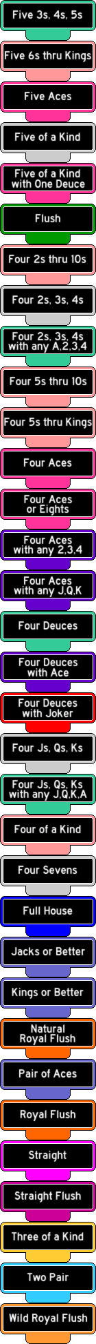 हालांकि यह खेल पारंपरिक पोकर नियमों के इर्द-गिर्द घूमता है और इसका लक्ष्य एक ही डेक से उचित कार्ड निकालकर डीलर को शीर्ष पर रखकर अपना सर्वश्रेष्ठ हाथ बनाना है, लेकिन इसमें एक मामूली बदलाव किया गया है: ड्यूस (2s) वाइल्ड हैं!