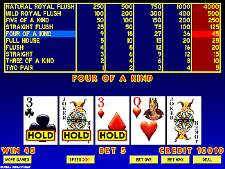 (इस बात को साबित करने के लिए: जैसा कि आप हमारे परीक्षण के स्क्रीनशॉट में देख सकते हैं, हमें शुरू में एक जोड़ी मिली, वह हाथ जो भुगतान तालिका पर भी नहीं है, और एक जोकर, जो एक तरह के तीन के लिए पर्याप्त था; दूसरे जोकर के लिए ड्रा प्रदान किया गया, और परिणामस्वरूप एक तरह के चार हो गए।)