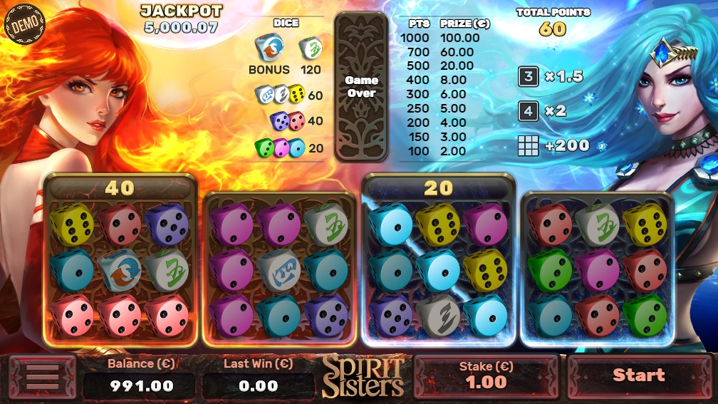 स्पिरिट सिस्टर्स एक अनोखा खेल है। इसमें चार 3x3 फ्रेम शामिल हैं। एक-एक करके, खिलाड़ी को तीन पासों का एक ऊर्ध्वाधर ढेर दिया जाएगा। खिलाड़ी चुन सकता है कि उसे चार फ्रेम में से किसमें रखना है। पासों का ढेर उस फ्रेम में सबसे बाईं ओर उपलब्ध कॉलम में जाएगा। खिलाड़ी किसी भी पंक्ति या विकर्ण में एक जैसे तीन चिह्न बनाकर अंक प्राप्त कर सकता है। जीत अर्जित अंकों की संख्या पर निर्भर करती है। एक पंक्ति या विकर्ण में तीन बोनस चिह्न प्राप्त करें और आप एक बोनस गेम खेलें।