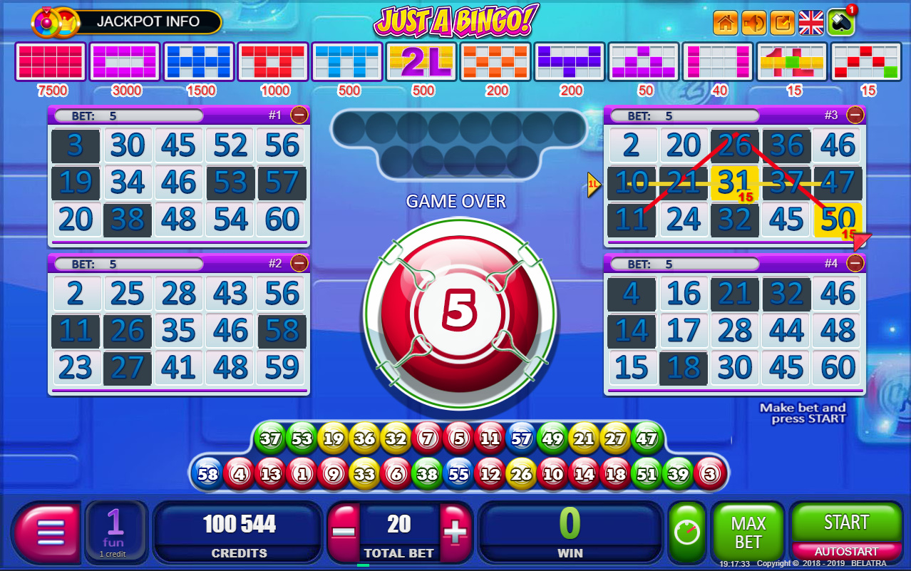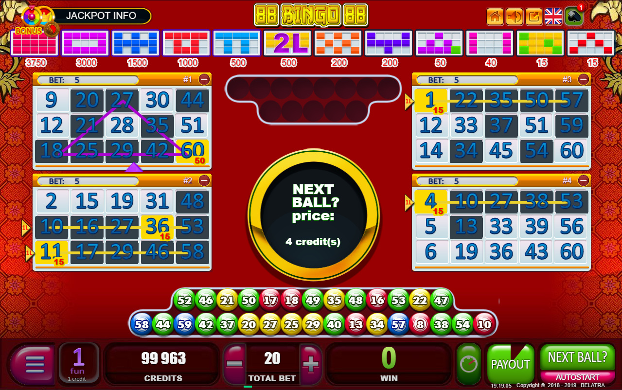 बेलात्रा में दो बिंगो गेम हैं, दोनों लैटिन अमेरिकी 3x5 कार्ड्स पर खेले जाते हैं। दोनों में अतिरिक्त गेंदें खरीदने की सुविधा भी है, जिनकी कीमत औसत गेंद की मदद के हिसाब से तय होती है।