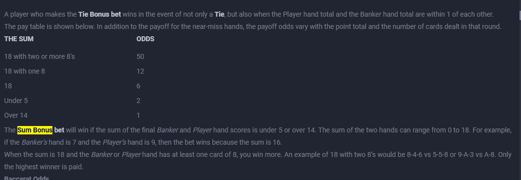 - योग बोनस : ? (सहायता फ़ाइल में इस शर्त का उल्लेख है जो खिलाड़ी और बैंकर के हाथों के बीच अंकों के योग के आधार पर भुगतान करती है, लेकिन मुझे यह नहीं मिल रहा है कि इसे टेबल पर कहां लगाया जाए। जब मुझे यकीन हो जाएगा कि यह शर्त कहीं भी, किसी भी तरह से लगाई जा सकती है, तो मैं इसका विश्लेषण करने का कष्ट उठाऊंगा।)