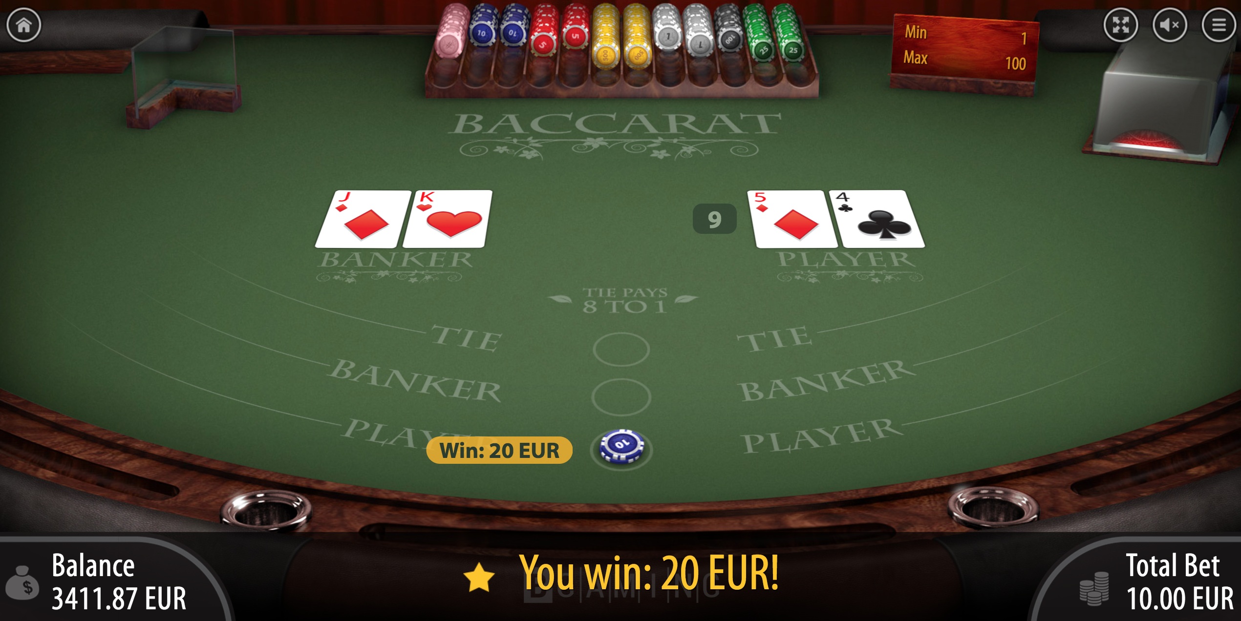 बैकारेट खेल काफी मानक है। इसमें सिर्फ़ तीन मुख्य दांव होते हैं, बैंकर, प्लेयर और टाई। टाई वाले दांव पर 8 से 1 का कंजूस दांव लगता है।