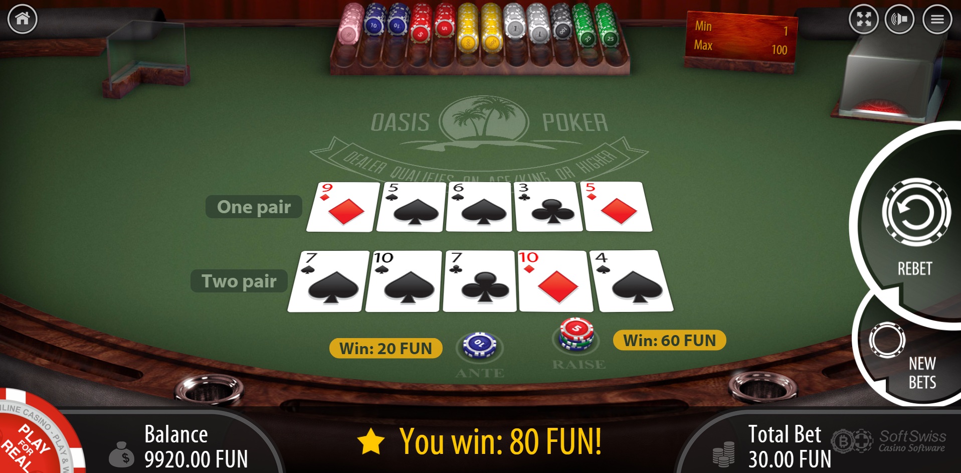 अगर आपने ओएसिस पोकर के बारे में कभी नहीं सुना है, तो बता दें कि यह कैरेबियन स्टड पोकर जैसा ही है, लेकिन इसमें एंटे की कीमत पर कार्ड बदलने का विकल्प भी शामिल है। इसमें सामान्य 1,2,3,4,5,7,20,50,100 पे टेबल का पालन किया जाता है। स्विचिंग सहित इष्टतम रणनीति के साथ, हाउस एज 1.04% है।