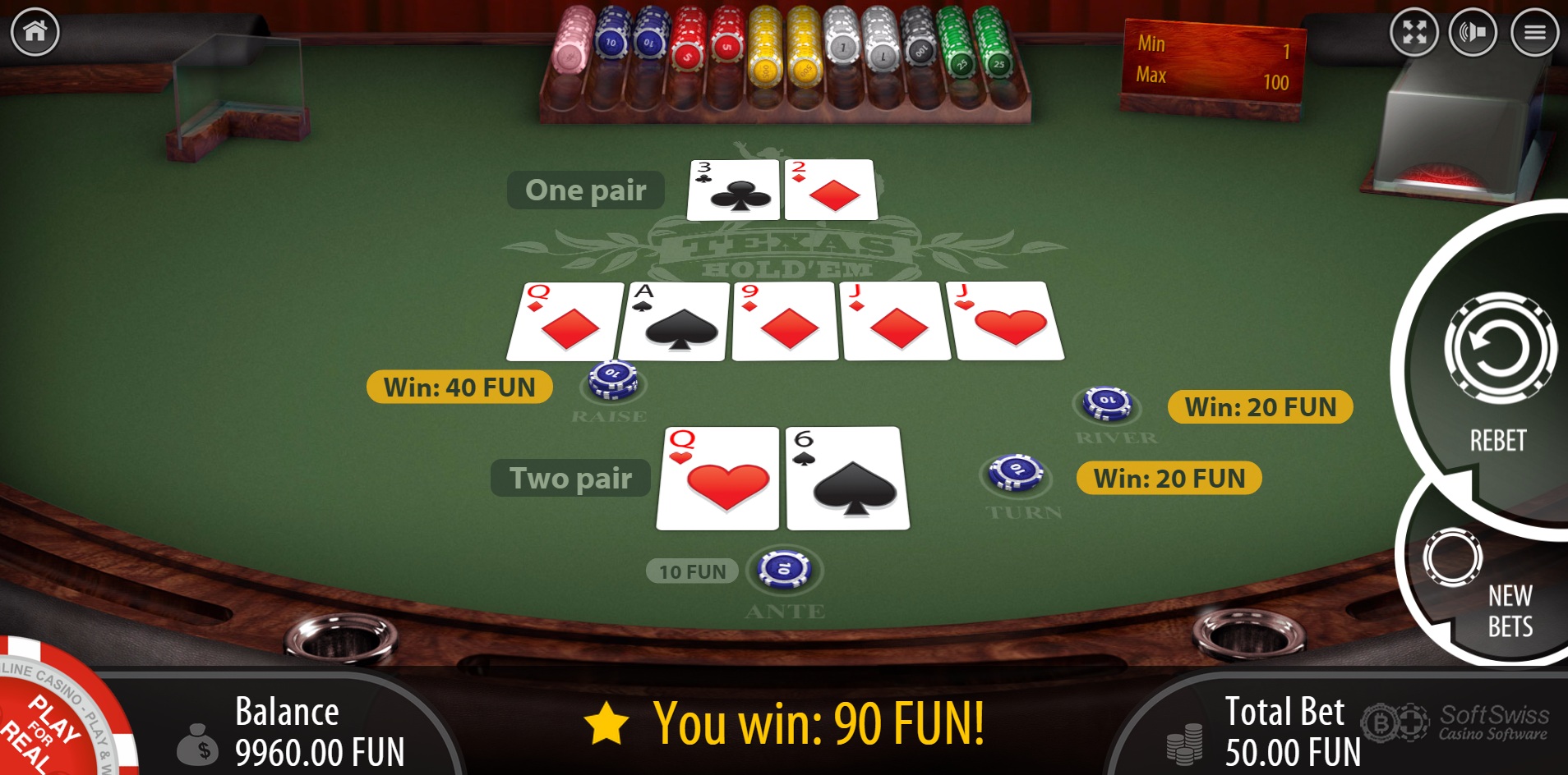 BGAMING , टेक्सास होल्ड 'एम बोनस के उदार लास वेगास नियमों का पालन करता है, जहाँ एंटे सीधे या उससे बेहतर दांव पर भुगतान करता है, और हाउस एज 2.04% है। गेम हेल्प फ़ाइल में रिटर्न 98.75% बताया गया है, जिस पर मुझे कोई आपत्ति नहीं है। मेरा मानना है कि वे इसे अपेक्षित रिटर्न और पूरी तरह से दांव पर लगाए गए पैसे के अनुपात के रूप में मापते हैं।