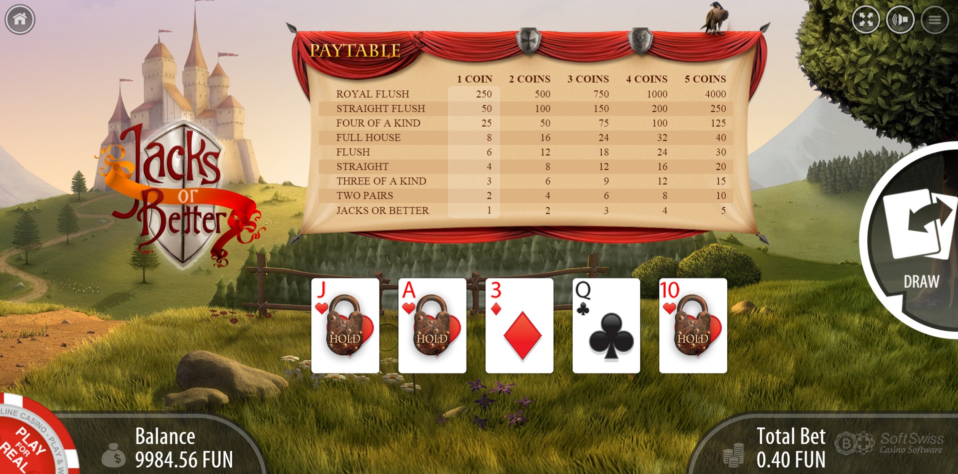 जहां तक मुझे पता है, बीगेमिंग द्वारा एकमात्र वीडियो पोकर गेम 8-6 जैक या बेहतर है, जिसमें इष्टतम रणनीति मानते हुए 98.39% का रिटर्न मिलता है।