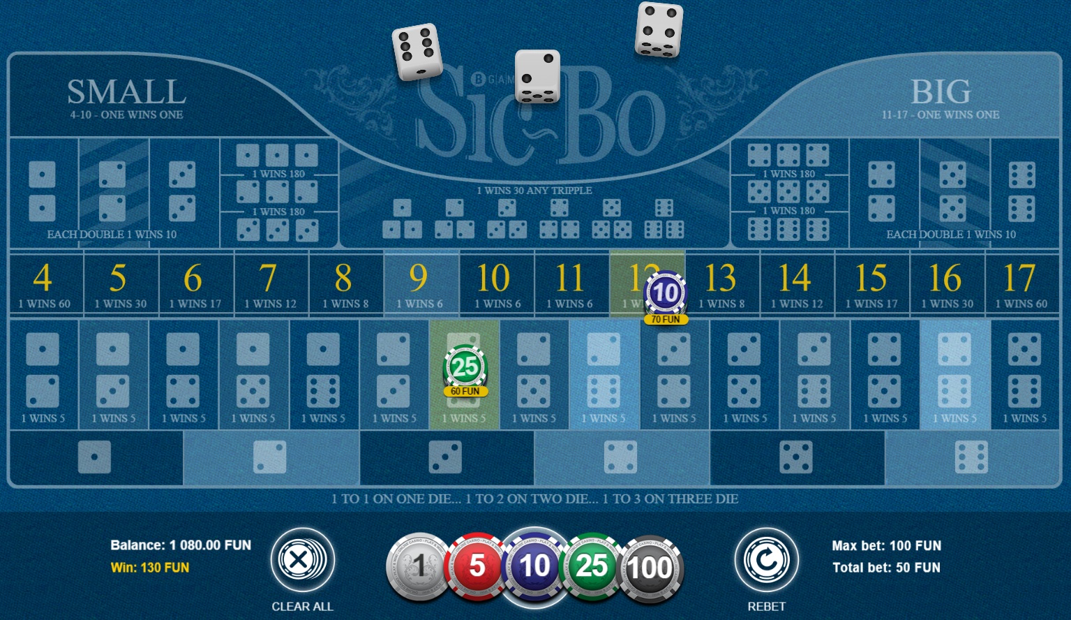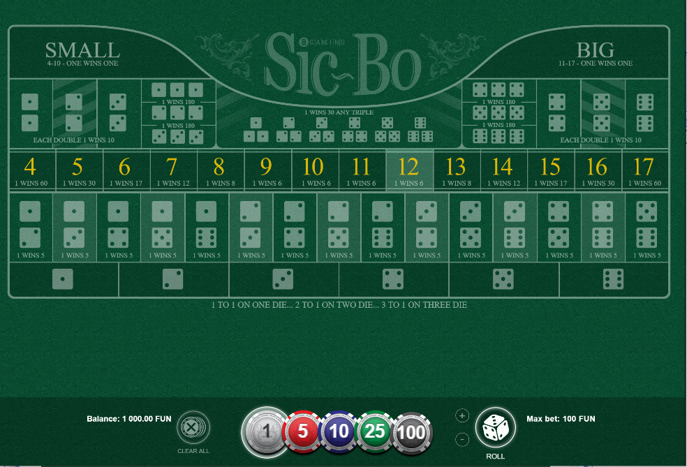 - सटीक रोल (तीन सिंगलटन) — यह क्रेप्स में एक आसान हॉप बेट की तरह है, सिवाय इसके कि इसमें तीन पासे होते हैं। खिलाड़ी एक विशिष्ट पासा रोल चुनता है जिसमें तीन सिंगलटन होते हैं। उदाहरण के लिए, 2-4-6। जीतने के लिए, खिलाड़ी को ठीक 2-4-6 रोल करना होगा। इस खेल में छह में से तीन पासों के सभी 20 संभावित संयोजन उपलब्ध हैं।