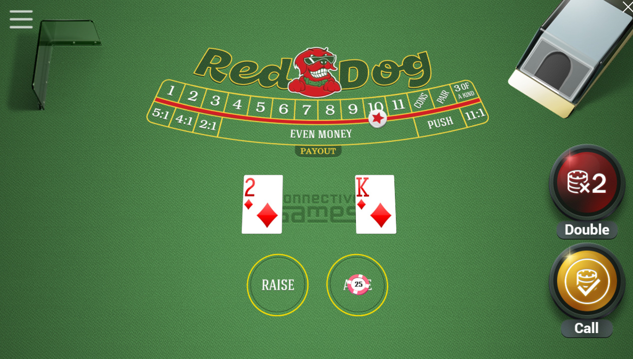रेड डॉग सामान्य नियमों और छह डेक कार्डों के साथ खेला जाता है। सही रणनीति के साथ, जो कि 7 या उससे अधिक के स्प्रेड के साथ रेज करना है, बेस गेम पर हाउस एज एंटे बेट के आधार पर 2.798% और एंटे और रेज बेट्स के संयुक्त आधार पर 2.375% है।