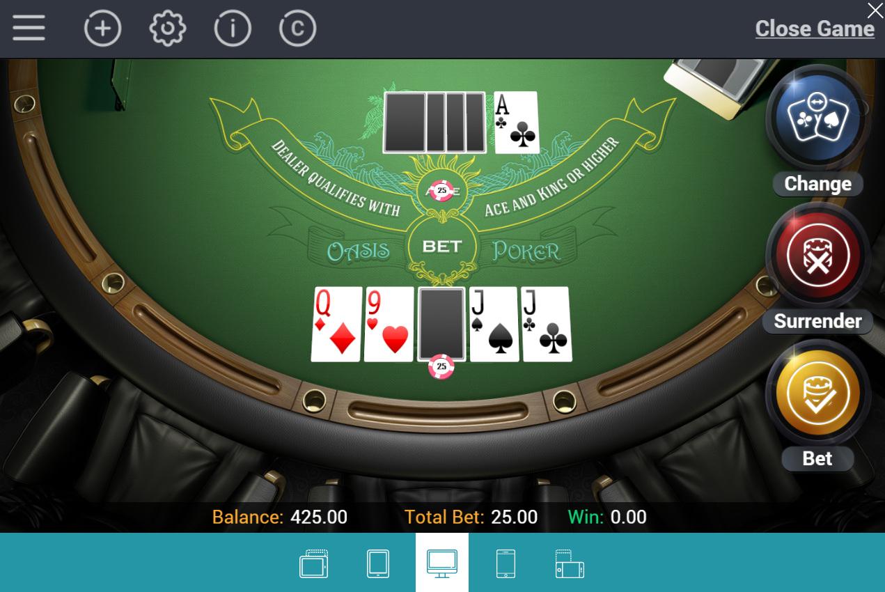 जो लोग इस खेल से परिचित नहीं हैं, उनके लिए ओएसिस पोकर और कैरेबियन स्टड पोकर एक जैसे ही हैं, बस फर्क इतना है कि खिलाड़ी रेज या फोल्ड का फैसला लेने से पहले एंटे की कीमत पर एक कार्ड बदल सकता है। खिलाड़ी एंटे की कीमत से दोगुने दाम पर एक ही समय में दो कार्ड बदल सकता है, लेकिन सही रणनीति यह है कि कभी भी दो कार्ड न बदलें।
