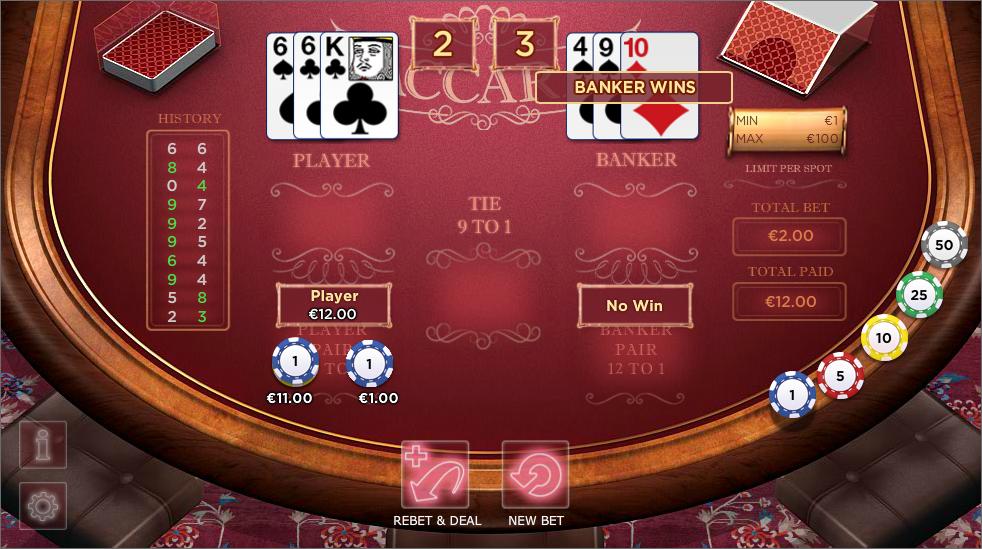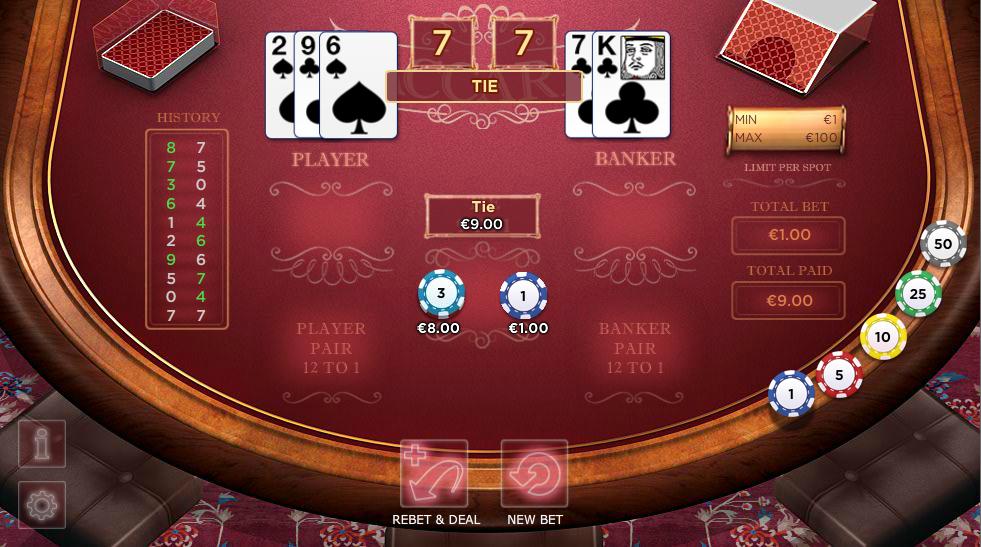 बैकारेट सामान्य ऑड्स के अनुसार खेला जाता है और छह डेक के साथ खेला जाता है। ध्यान देने वाली बात यह है कि मेज़पोश पर लिखा है कि टाई होने पर 9 से 1 और जोड़ी होने पर 12 से 1 का भुगतान होता है, लेकिन यह गलत है। दोनों दांव जीतने तक खेलने के बाद, वे टाई होने पर 1 के बदले 9 और जोड़ी होने पर 1 के बदले 12 का भुगतान करते हैं।
