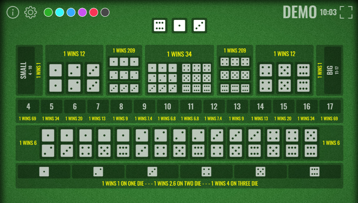 लाल या काले पासे के परिणाम पर छह-छह दांव लगते हैं। प्रत्येक पर 1 के लिए 5.83 का भुगतान होता है, जिससे हाउस एज 2.83% होता है।