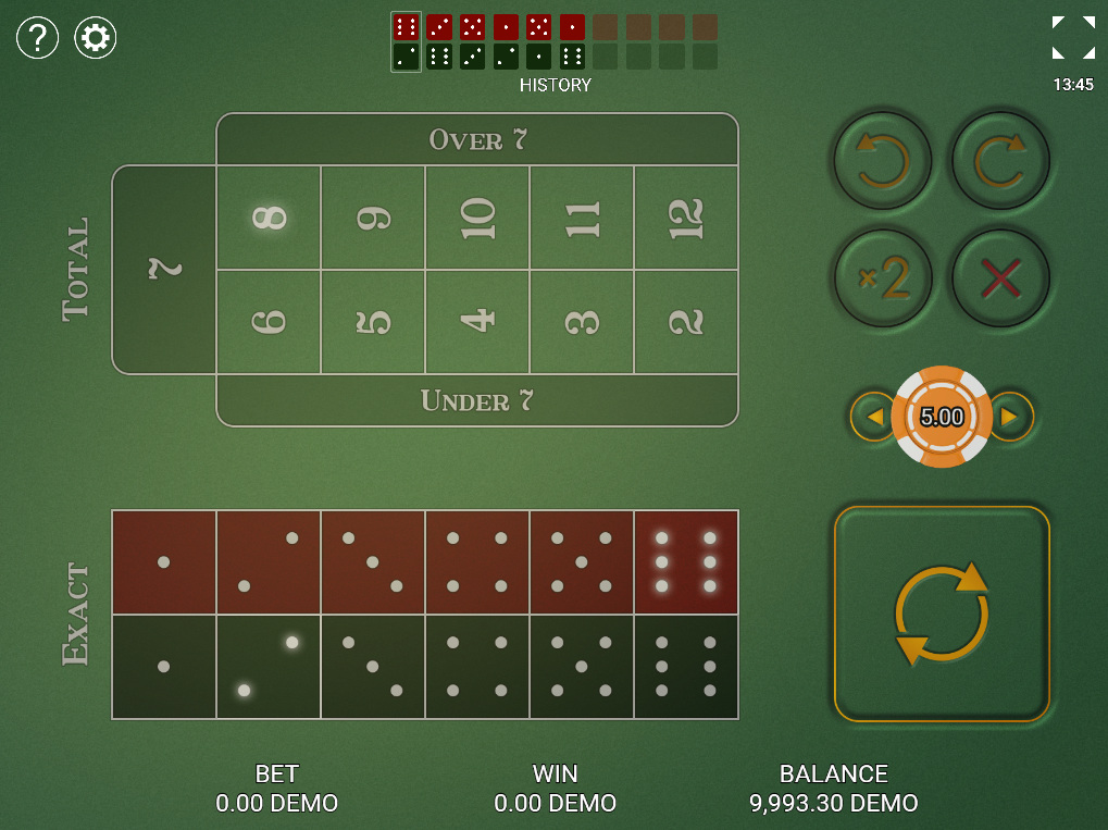 टाइटन डाइस एक सरल खेल है, जो दो पासों, एक लाल और एक काले, के रोल पर आधारित है। खिलाड़ी किसी विशिष्ट पासे के योग या परिणाम पर दांव लगा सकता है। नीचे दी गई तालिका संयुक्त योग पर दांव दिखाती है। जीत "एक के लिए" के आधार पर होती है।