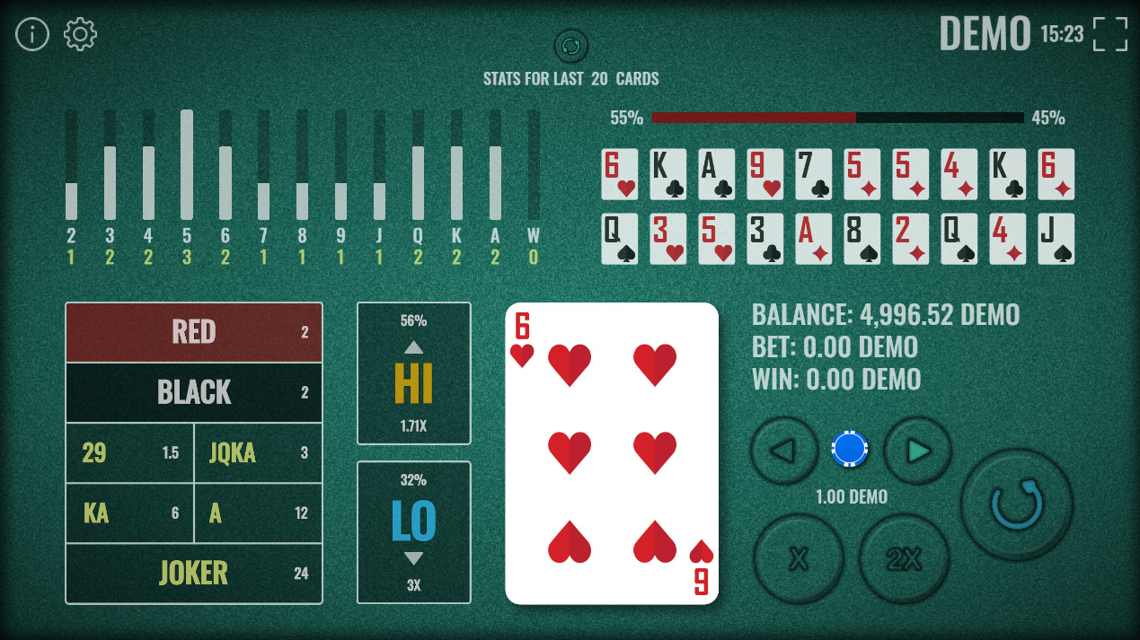 - खिलाड़ी निकाले जाने वाले अगले कार्ड पर विभिन्न दांव लगा सकता है, जिसमें अंतिम कार्ड से अधिक या कम दांव लगाना भी शामिल है, सिवाय इसके कि कोई भी दांव ऐसा न हो जिसे जीतना असंभव हो, जैसे 2 से कम।
