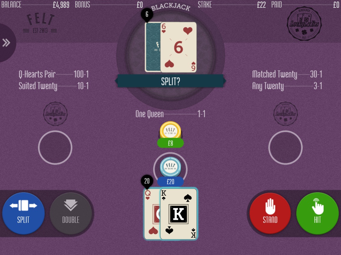 फेल्ट सात ब्लैकजैक गेम प्रदान करता है। इन सभी के मूल नियम समान हैं: