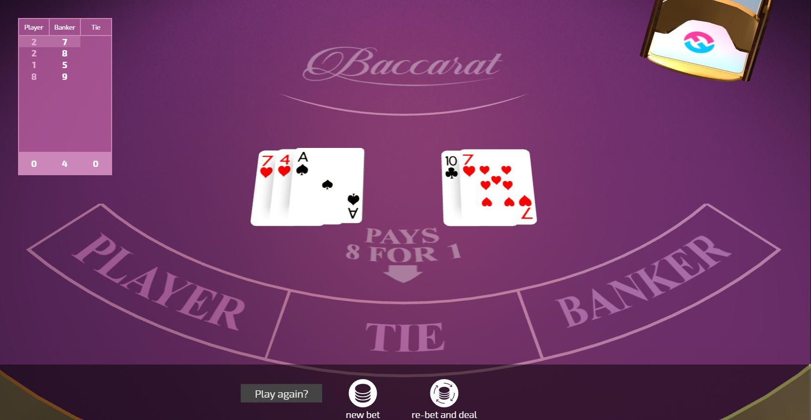 फ़नफ़ेयर बैकारेट गेम बुनियादी बातों पर आधारित है, यानी सिर्फ़ प्लेयर, बैंकर और टाई बेट्स। हेल्प फ़ाइल में दावा किया गया है कि अनगिनत डेक इस्तेमाल किए जाते हैं, लेकिन हेल्प फ़ाइल में दिए गए रिटर्न छह डेक वाले गेम के रिटर्न से मेल खाते हैं। आपको खुद तय करना होगा कि किस पर विश्वास करना है। यहाँ दोनों तरफ़ हाउस एज के आंकड़े दिए गए हैं।