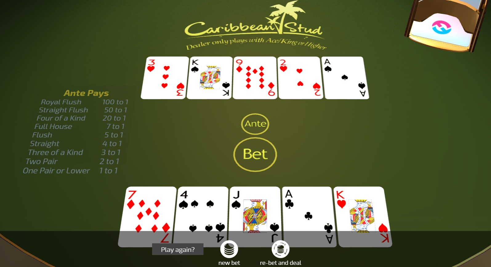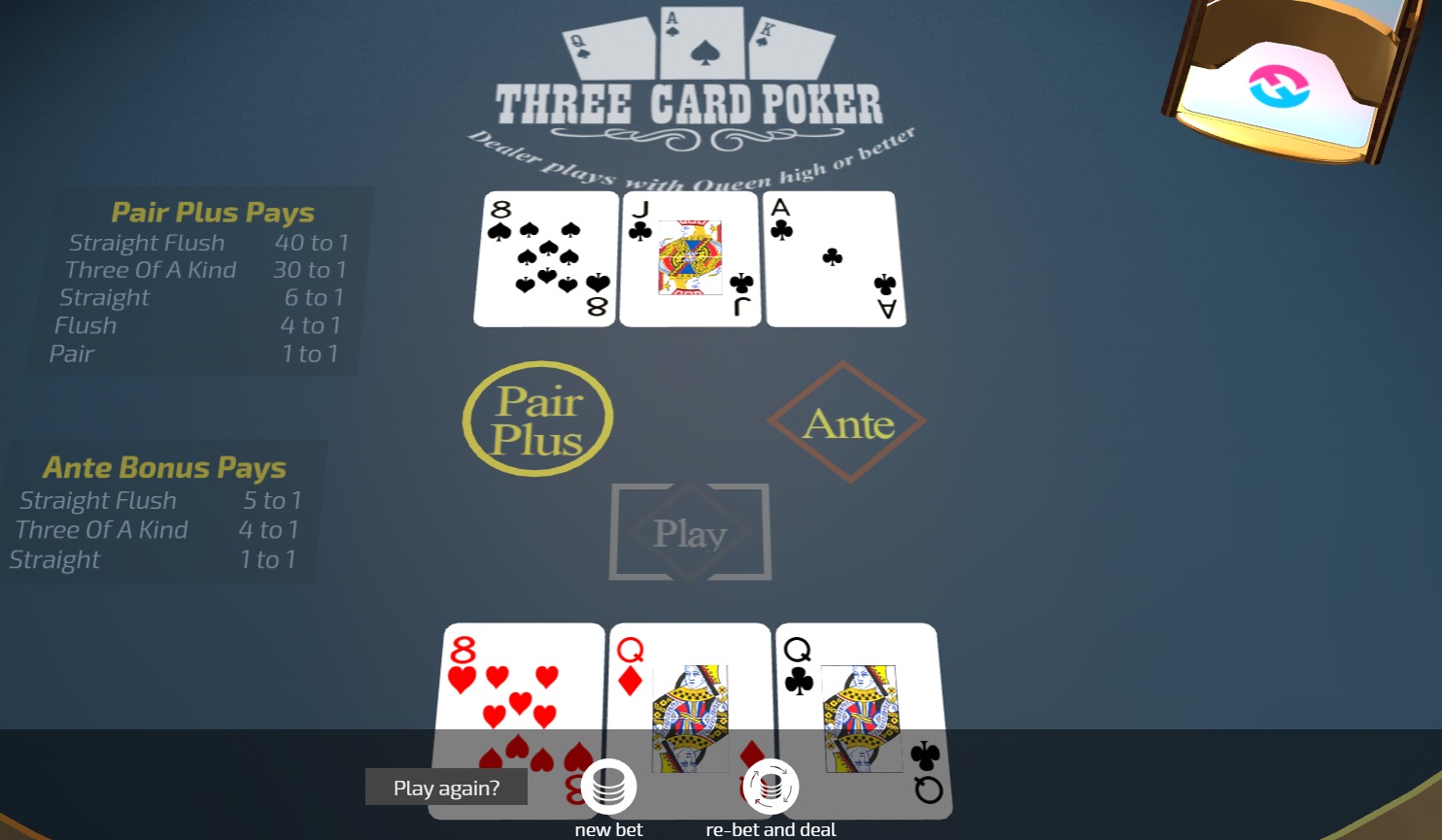 थ्री कार्ड पोकर उदार 1-4-5 एंटे बोनस और 1-4-6-30-40 पेयरप्लस भुगतान तालिका का अच्छी तरह से पालन करता है। इसके परिणामस्वरूप हाउस एज इस प्रकार होता है: