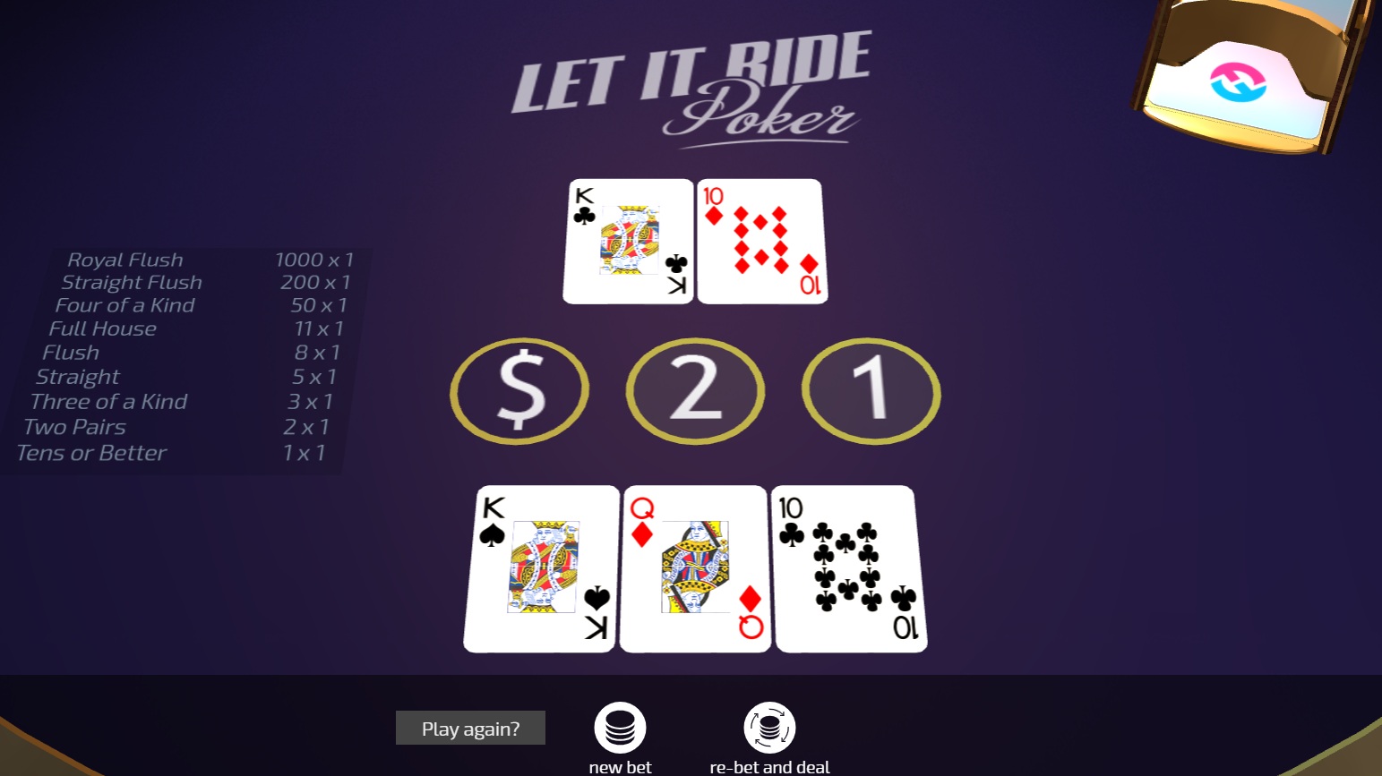 फनफेयर, लेट इट राइड में सामान्य 1-2-3-5-8-11-50-200-1000 भुगतान तालिका का अनुसरण करता है, जिसमें 3.51% का हाउस एज होता है।