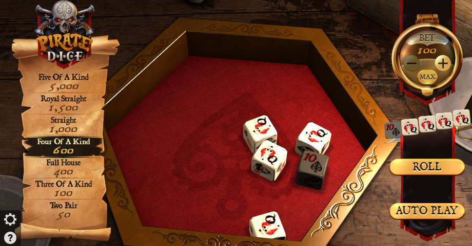 पाइरेट डाइस पाँच पोकर पासों के उछाल पर आधारित एक सरल खेल है। इसमें केवल एक ही दांव लगाना होता है और कोई निर्णय नहीं लेना होता। खिलाड़ी को पाँच पासों के पोकर मूल्य के आधार पर भुगतान किया जाता है। कुल मिलाकर, अपेक्षित रिटर्न 96.45% है। अधिक जानकारी के लिए, कृपया पाइरेट डाइस पर मेरा पेज देखें।
