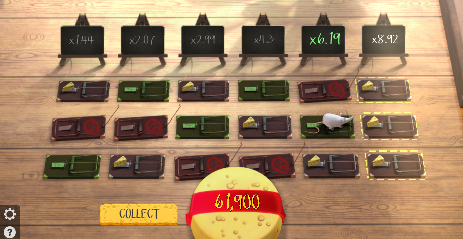 द ग्रेट चीज़ हीस्ट एक साधारण बारूदी सुरंग जैसा खेल है। इसमें एक चूहा पनीर और चूहेदानियों से सजी एक बारूदी सुरंग में घूमता है। चूहा जितना ज़्यादा पनीर पाता है, उतना ही ज़्यादा जीतता है। हर अगला कदम एक शर्त की तरह है जिस पर 96% रिटर्न मिलता है। सभी नियमों और विश्लेषण के लिए, कृपया द ग्रेट चीज़ हीस्ट पर मेरा पेज देखें।