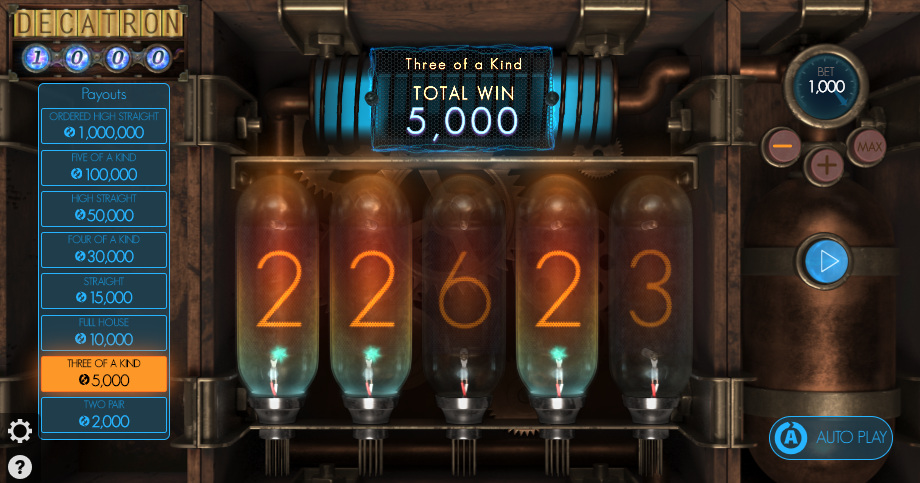 डेकाट्रॉन, फनफेयर टेक्नोलॉजीज़ का एक सरल "इंस्टेंट" गेम है। इसमें केवल एक ही दांव होता है, जो 0 से 99999 के बीच किसी भी यादृच्छिक संख्या के पोकर मूल्य के अनुसार भुगतान करता है। इसका अंतिम परिणाम 97.05% का रिटर्न है। सभी नियमों और विश्लेषण के लिए, कृपया डेकाट्रॉन पर मेरा पेज देखें।