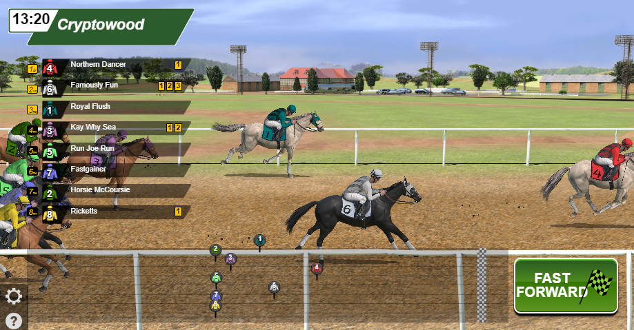 डर्बी डे हॉर्सेज़ एक साधारण "डर्बी" शैली का रेसिंग गेम है। इस गेम में आठ घोड़े होते हैं और दांव लगाने के तीन पारंपरिक तरीके होते हैं - जीत, जीत और जीत। गणित करने पर, मुझे पता चला कि रिटर्न 96.7% से 96.9% के बीच है। हेल्प फ़ाइल 97% रिटर्न का दावा करती है।