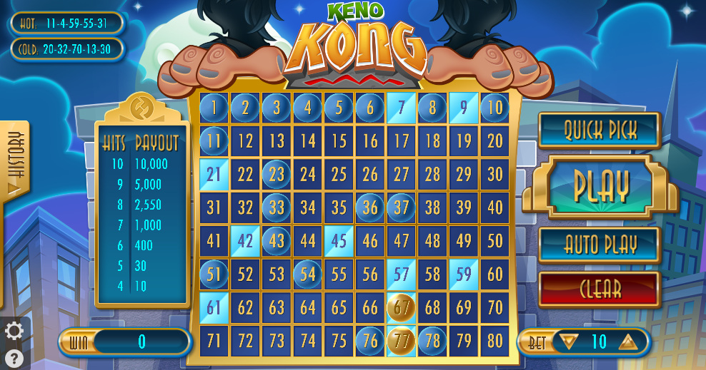 फनफेयर अपने केनो गेम को केनो काँग कहता है। यह 80 गेंदों में से 20 गेंदों के ड्रॉ के सामान्य नियमों का पालन करता है। नीचे दी गई तालिका 3 से 10 पिक्स के लिए भुगतान तालिका और प्रत्येक के लिए रिटर्न दिखाती है।