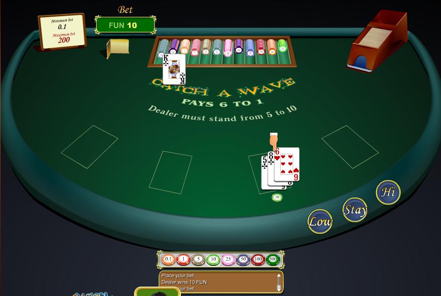 मेरे जैसे पुराने खिलाड़ियों के लिए, कैच अ वेव पुराने टीवी गेम शो कार्ड शार्क्स पर आधारित है। इसका उद्देश्य यह अनुमान लगाना है कि शू में अगला पत्ता पिछले पत्ते से छह गुना ज़्यादा ऊँचा है या कम। खिलाड़ी के पास रास्ते में खड़े होने का विकल्प भी होता है, जिससे डीलर के पास खिलाड़ी को हराने का मौका होता है।
