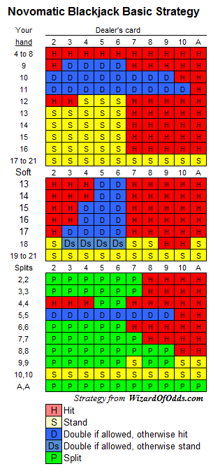 नीचे एक बुनियादी रणनीति दी गई है जो चार से आठ डेक के लिए उपयुक्त है। बड़े संस्करण के लिए चित्र पर क्लिक करें।