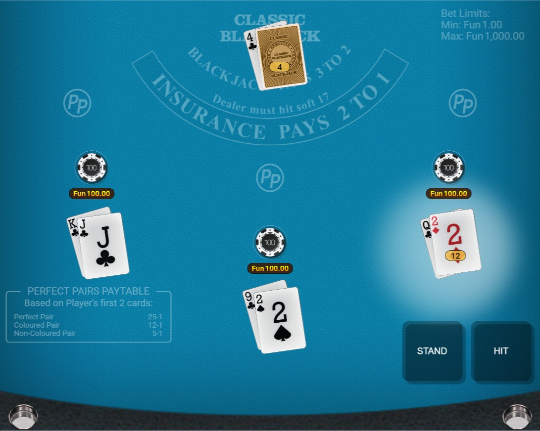 परफेक्ट पेयर्स गेम 5-12-25 भुगतान तालिका का उपयोग करके परफेक्ट पेयर्स साइड बेट प्रदान करता है।