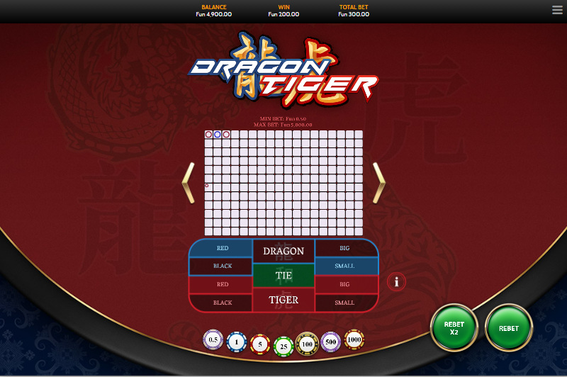 ड्रैगन टाइगर गेम मानक नियमों का पालन करता है। खिलाड़ी जीतने वाली टीम, बराबरी, और दोनों टीमों के लाल या काले और ज़्यादा या कम होने पर दांव लगा सकता है। बराबरी वाली शर्त पर 10 से 1 का भुगतान होता है (जो कि कुछ प्रतिस्पर्धी सॉफ़्टवेयर ब्रांडों की तुलना में बेहतर है जो केवल 8 से 1 का भुगतान करते हैं)। एक स्कोरबोर्ड भी है, जिससे मुझे लगता है कि खेल एक जूते से खेला जाता है। शायद रंग और ज़्यादा/कम दांव गिनने योग्य हों (चुप रहो विज़!), लेकिन मैं इसे पाठक के लिए एक अभ्यास के रूप में छोड़ता हूँ।