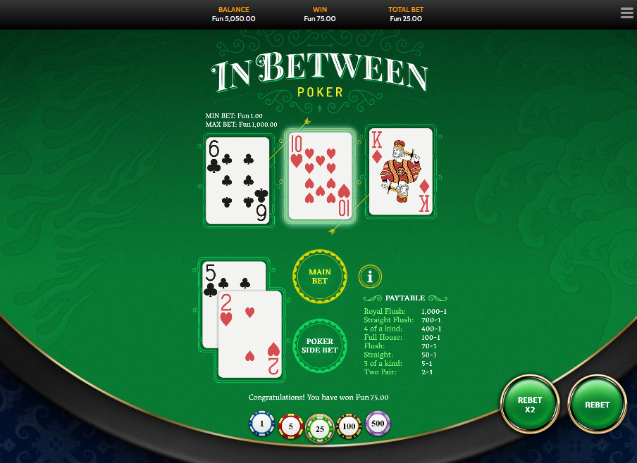 जहाँ तक मुझे पता है, " इन बिटवीन " वनटच का एक अनोखा खेल है। इसमें तीन कार्ड एक पंक्ति में रखे जाते हैं और अगर बीच वाला कार्ड बाएँ और दाएँ कार्ड के बीच में आता है, तो जीत होती है। जीतने का दूसरा तरीका दो-कार्ड वाला हाथ भी है। अधिक जानकारी के लिए कृपया लिंक पर क्लिक करें।