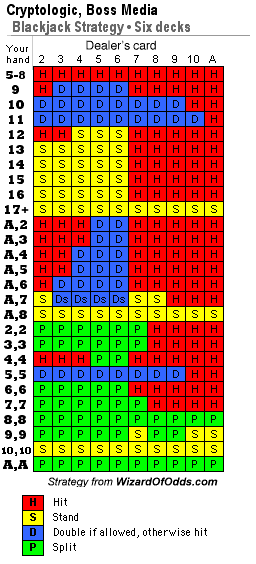 सही बुनियादी रणनीति क्रिप्टोलॉजिक और बॉस मीडिया मल्टी-प्लेयर के लिए समान ही है, जो इस प्रकार है। ध्यान दें कि दसियों को विभाजित करने के बाद ब्लैकजैक में 3-2 से जीतने के बावजूद, खिलाड़ी को उन्हें कभी भी विभाजित नहीं करना चाहिए।