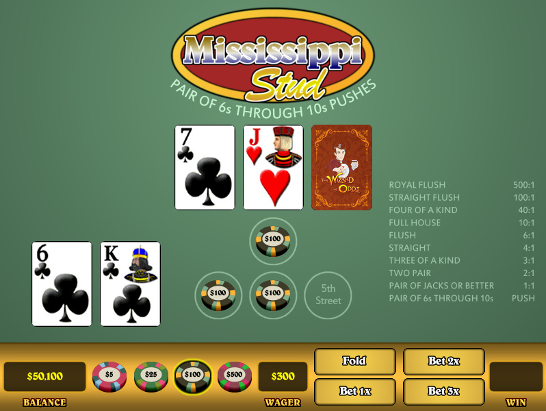 मिसिसिपी स्टड पिछले दशक के सबसे सफल पोकर प्रकारों में से एक है। इसका उद्देश्य एक उच्च रैंकिंग वाला पाँच-कार्ड पोकर हाथ प्राप्त करना है। इसमें डीलर का कोई हाथ नहीं होता जिसे हराना हो। जैसे-जैसे कार्ड खुलते हैं, खिलाड़ी को छोटी, बड़ी रेज या फोल्ड करने का फैसला करना होता है। इस रणनीति को आसानी से एक इंडेक्स कार्ड पर फिट किया जा सकता है।