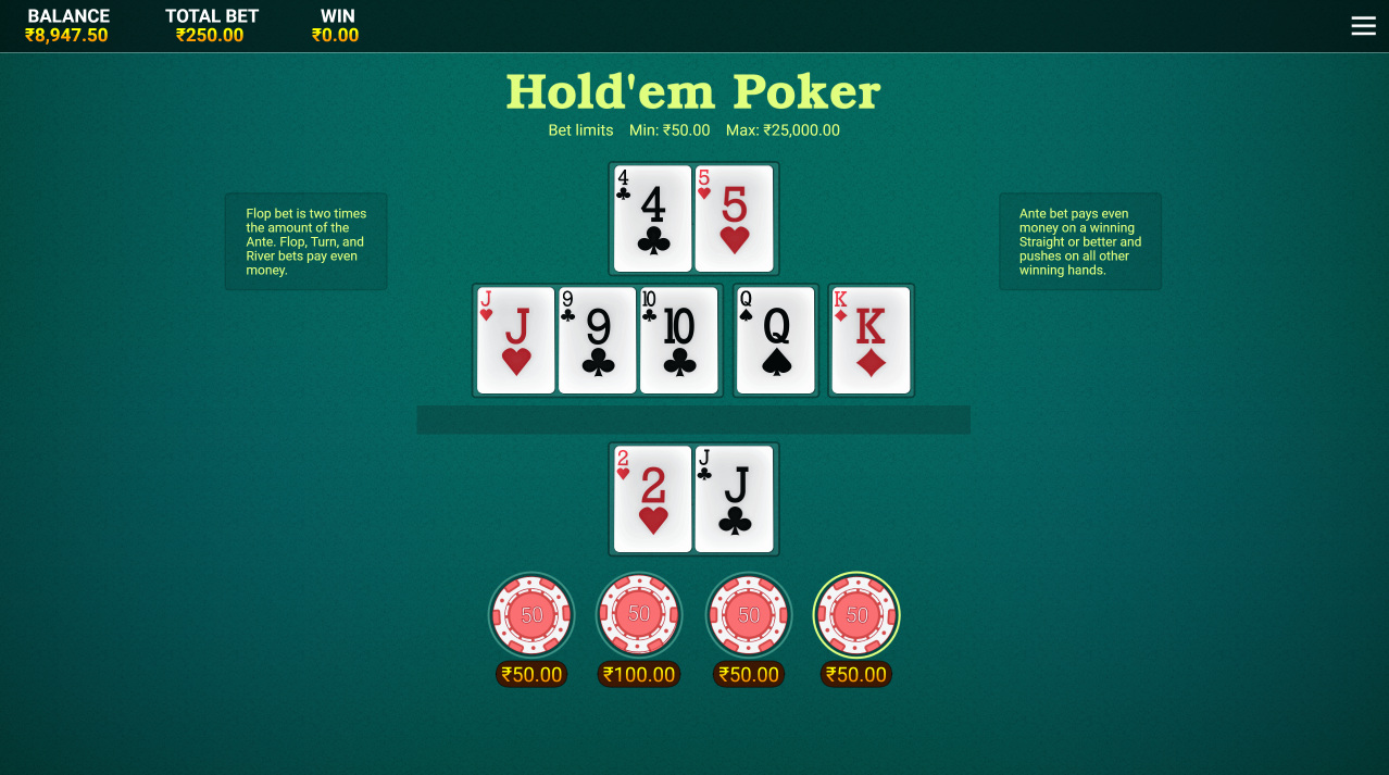 होल्ड 'एम पोकर और टेक्सास होल्ड 'एम बोनस एक ही चीज़ हैं। सुपर स्पेड 0.53% के कम जोखिम तत्व (दांव पर लगाए गए धन के मुकाबले अपेक्षित नुकसान का अनुपात) के लिए उदार वेगास नियमों का पालन करता है।