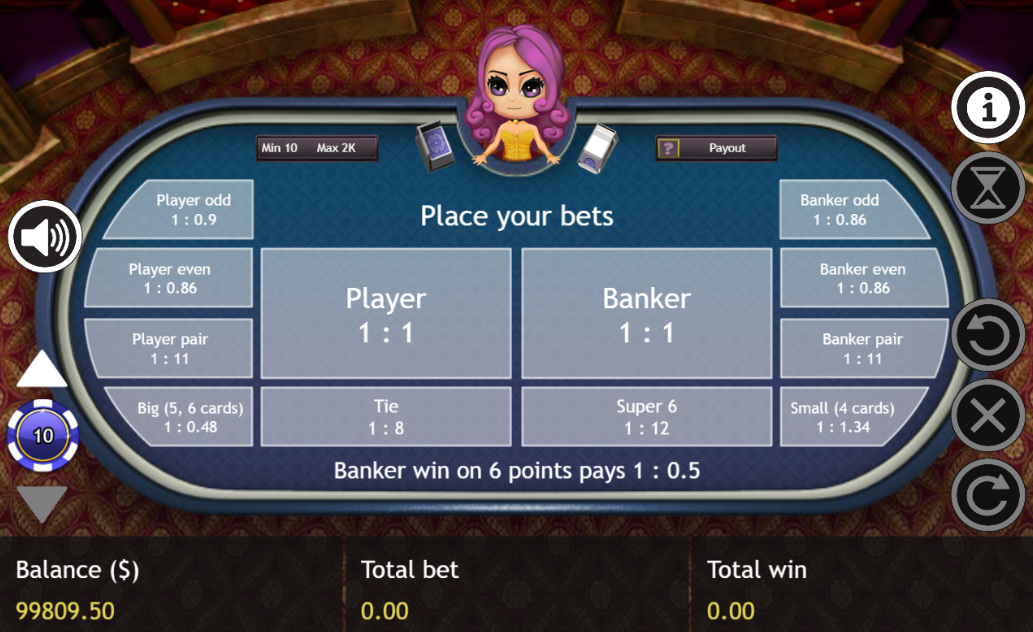 बैकारेट खेल मानक नियमों के अनुसार खेला जाता है, जिसमें जीतने वाले बैंकर बेट पर 0.95 का भुगतान किया जाता है। कई साइड बेट भी हैं, जो नीचे दिए गए सुपर 6 सेक्शन में दिए गए बेट से बिल्कुल मिलते-जुलते हैं। मुख्य अंतर केवल इतना है कि बैंकर बेट पर हाउस एज 1.06% है, जबकि सुपर 6 में यह 1.46% है, और इसमें कोई सुपर 6 साइड बेट नहीं है।