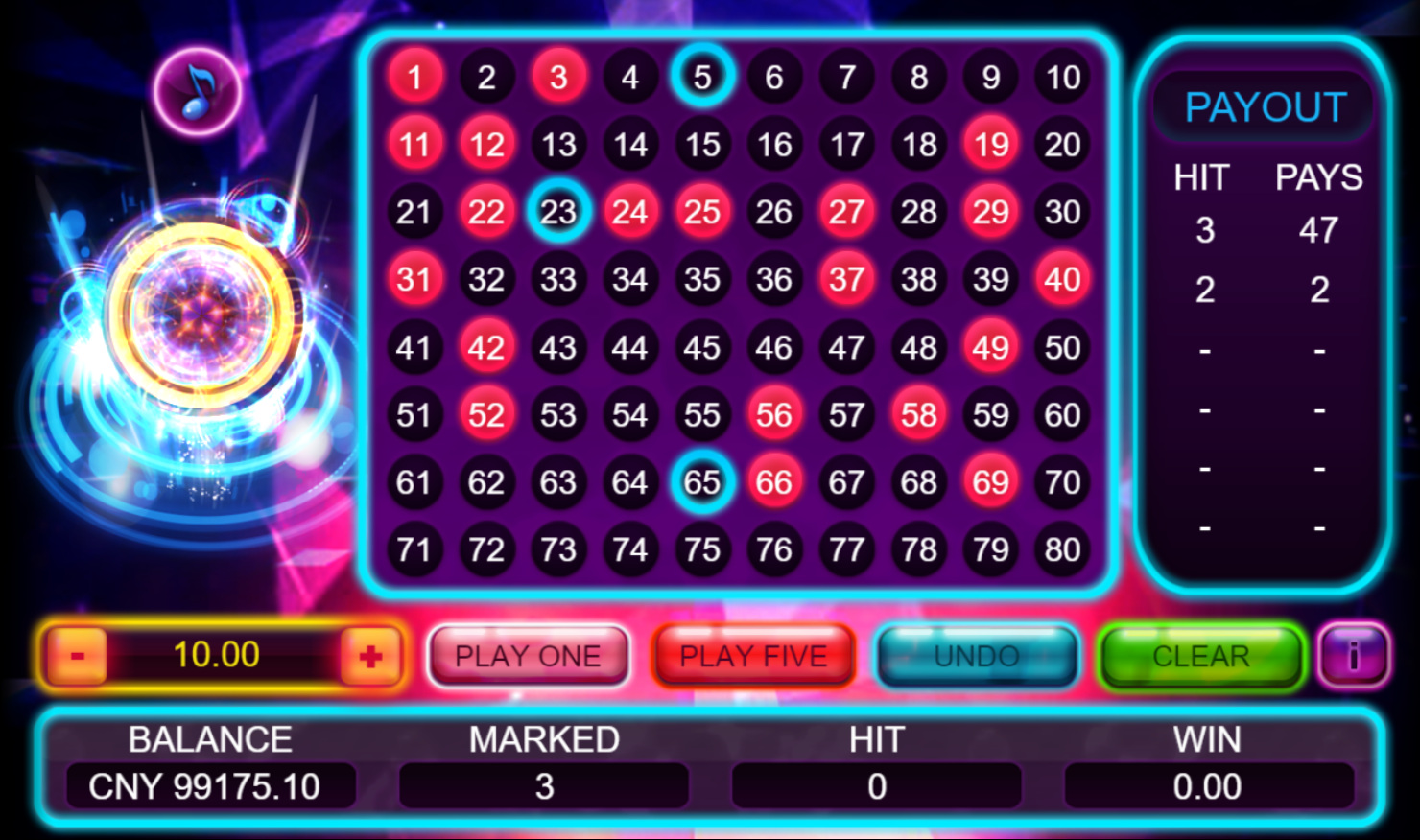 ट्रिपल पीजी अपने केनो गेम को नियॉन केनो कहते हैं। यह शायद अब तक का सबसे तेज़ केनो गेम है जो मैंने देखा है। इस गेम में एक टोकरी से 20 गेंदें निकालने के बजाय, कार्ड पर 20 नंबरों पर लेज़र से निशाना साधा जाता है। हालाँकि, गणित वही रहता है।