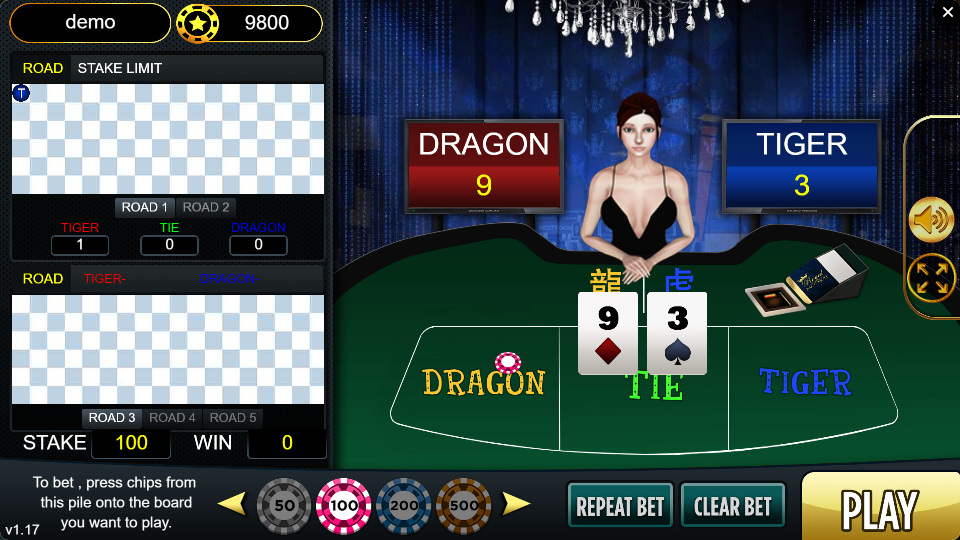 ड्रैगन टाइगर गेम भी बैकारेट जितना ही धीमा है। इसमें भी खिलाड़ी को एक पत्ता पलटना पड़ता है, जब तक कि वह सिर्फ़ टाई पर ही दांव न लगाए। हमेशा की तरह, वे टाई होने पर बेहद कंजूस 8 से 1 का ऑड्स देते हैं। बैकारेट की तरह, वे सभी पाँचों "रोड्स" वाला एक स्कोर बोर्ड भी देते हैं। पेश किए गए तीन दांवों पर हाउस एज इस प्रकार है:
