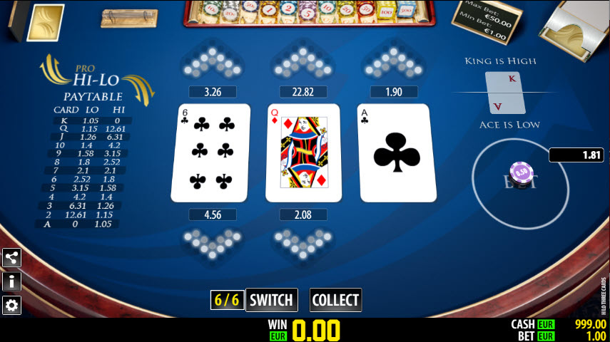 हाय लो एक सरल खेल है जिसमें यह अनुमान लगाया जाता है कि कोई यादृच्छिक कार्ड, सामने वाले कार्ड से बड़ा होगा या छोटा। इस खेल के अन्य प्रस्तुतियों के विपरीत, WM में खिलाड़ी तीन खुले कार्डों में से किसी एक पर दांव लगा सकता है। नीचे दी गई तालिका में सभी उपलब्ध दांवों के लिए भुगतान तालिका, जीतने की संभावना और अपेक्षित प्रतिफल दर्शाया गया है।
